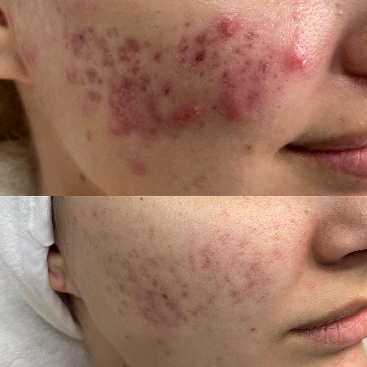Bereits nach der ersten Behandlung war die Veränderung sichtbar. Jetzt, ein Jahr später, gehört die Akne der Vergangenheit an. Aktuell behandeln wir noch die Narben. Ich bin zuversichtlich, dass auch diese bald nicht mehr sichtbar sein werden.